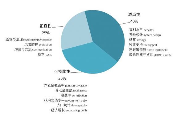 用于反应现有的体系建设是否能支撑未来养老金需求的可持续性被赋予了次高的权重,而最低权重的正直性则主要反应政府监管以及民众信心。