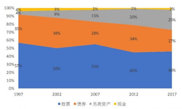 1997~2017 养老金规模最大的前7个国家的资产配置比例