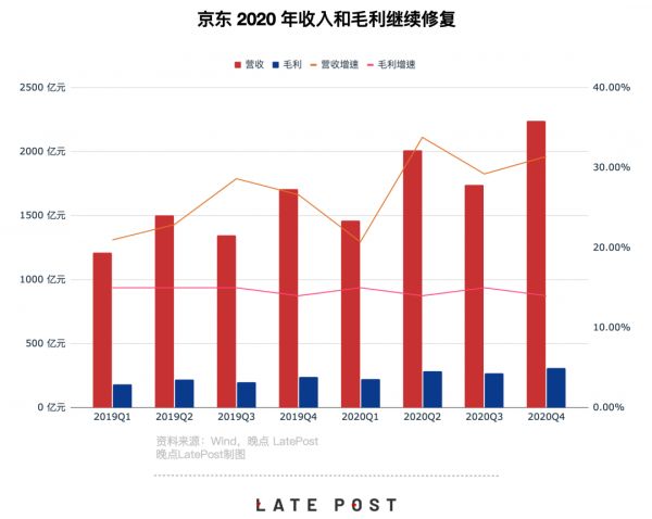 抛开受疫情影响、业绩严重失真的一季度,去年二季度以后京东基本回到了之前的经营轨道上,季度收入增速保持在 30% 左右、毛利率则徘徊在 15%、八成左右的新用户来自低线城市。