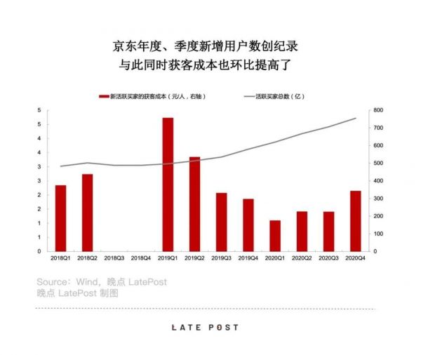 所以这也是为什么在规模效应的帮助下,京东去年四季度的毛利率依旧只有 15%。而拼多多去年三季度毛利率高达 77%。而且,原来低频、高消的商品结构也容易对持续获客造成压力。2020 年第四季度,京东单活跃买家的成本增加到了 344 元、环比三季度多了 118 元。