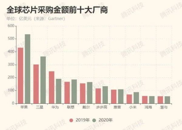2020年,除华为外,其他芯片采购大厂的采购金额都增加了 (数据来源:Gartner)