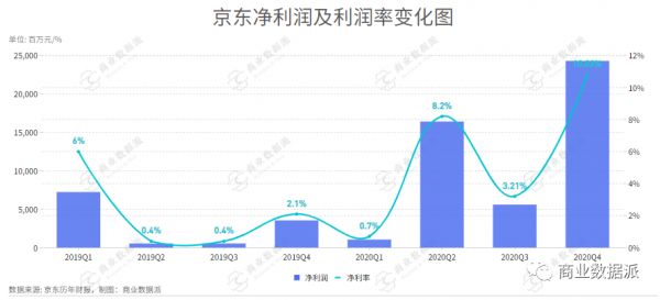 几大电商节加上下沉市场的助力,京东整个2020年的营业收入大涨,全年经营利润为 123 亿元人民币,同比增达36.67%。不过,京东在2020年第四季度的毛利率为近两年来最低水平,相信这也是在投入期不得不付出的短期代价,随着在下沉市场布局的成熟,相信这一情况会有所改善。