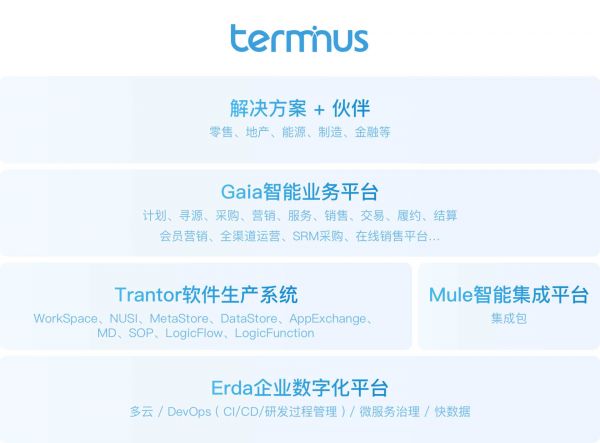 围绕这个目的,端点建立了一整套的Terminus企业数字化生态研发体系:技术底座——企业数字化平台Erda、软件生产系统Trantor、企业智能业务平台Gaia、智能集成平台Mule以及设计体系NUSI,使端点具备了生产可定制SaaS化产品的能力,为企业客户提供端到端的解决方案,满足各行业不同客户的各类需求。