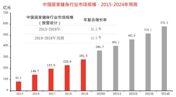未来5年,随着健身概念的进一步普及,以及人们对提高免疫力,增强身体素质的需求提高,预计2019年至2024年,中国居家健身市场规模(按营收计)将从281.5亿元增长至578.5亿元,年复合增长率达15.5%。