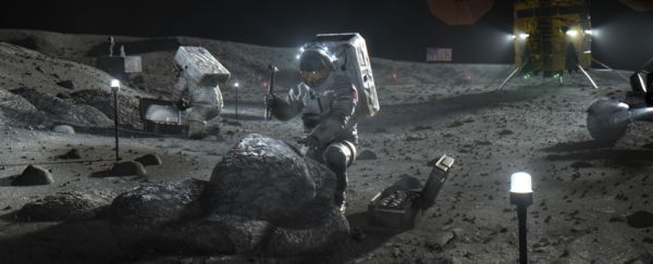 月神计划想象图,描绘了登陆后在月球表面展开勘测工作的宇航员 | nasa.gov