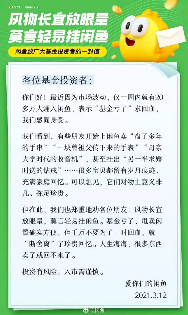 在这封闲鱼致广大基金投资者的一封信中,提到了“最近因为市场波动,仅一周内就有20多万人涌入闲鱼,表示‘基金亏了’求回血。我们感同身受。”