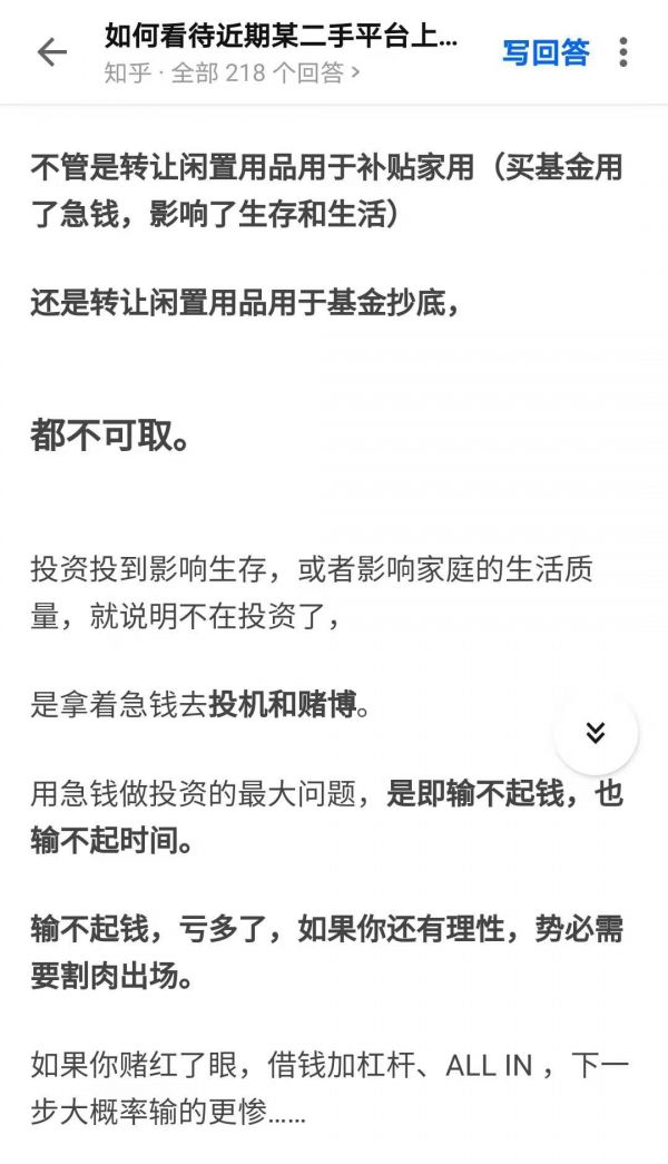 还有的投资者也在留言中提醒:“还是那句老话,闲钱投资。不管是转让闲置用品用于补贴家用,还是用于基金抄底,都不可取。”