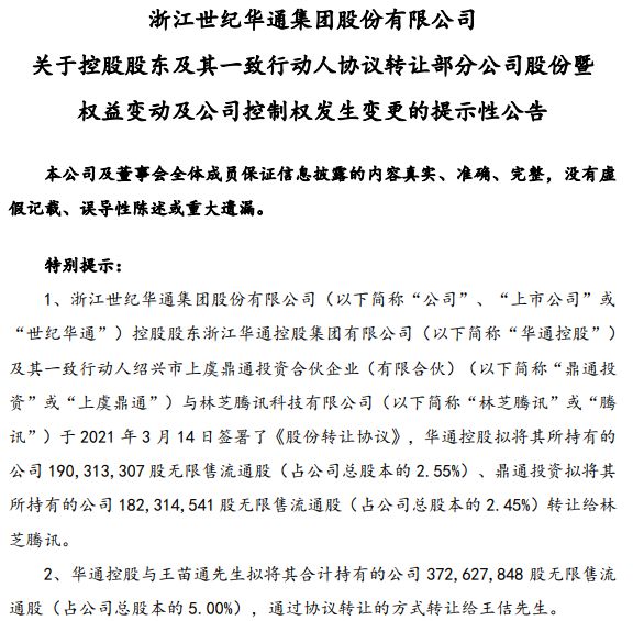 3月14日晚,世纪华通公告称,控股股东华通控股及其一致行动人拟分别将持有的公司2.55%、2.45%股份,转让给公司持股5%以上大股东林芝腾讯,转让价款总计约为27.95亿元。权益变动完成后,林芝腾讯将直接持有世纪华通7.45亿股股份,持有上市公司10%的股份,成为世纪华通第二大股东。