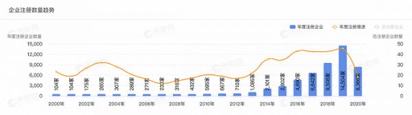 天眼查专业版数据显示,我国美容仪相关企业的注册量自2014年开始增速迅猛,在2019年达到井喷,一年内注册数近一万五千家,增速超过50%。