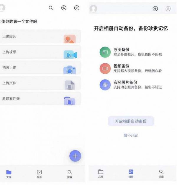 根据界面新闻的体验,新的“阿里云盘”APP界面较为简洁,支持的功能主要是上传图片、视频、文件和相册自动备份等。