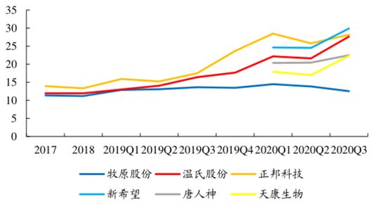 在非洲猪瘟的推动下,行业中小养殖户加速出清,相反,行业内上市猪企不断加大扩张规模,2020Q1-Q3牧原股份、新希望、正邦科技、温氏股份资本开支大幅增长,分别同比增长441%、374%、250%、203%。