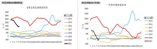 显而易见,外购仔猪带来的后果就是成本上升、利润率下降。如图所示,自繁自养生猪养殖利润随着猪价下降,降低至1500元/头左右,但外购仔猪养殖利润已基本抹平。