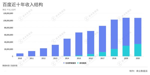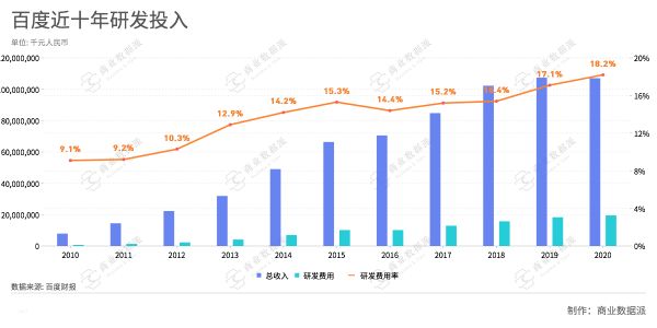 在研发投入方面也能看到变化,百度的研发费用由2010年的79亿元,上升到了2020年的人民币195亿元,研发占收入的比重也在不断提升。