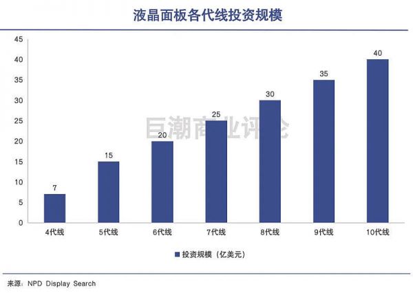 在实践中,LCD产线世代线不断升级迭代,投入也越来越高。从90年代的1、2代线迭代到如今的10.5代线,后来者不断砸下更多的钱,投向更先进的设备,实现对先发者的赶超。