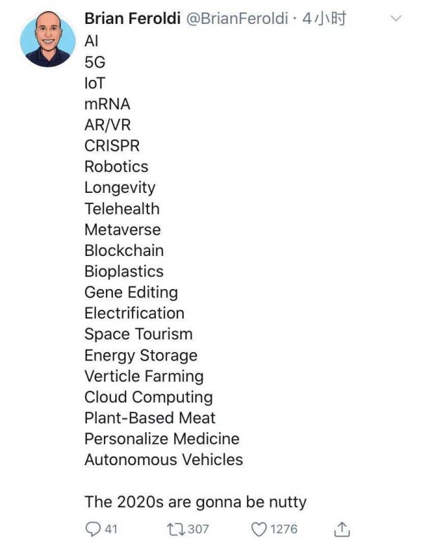 在推特上关注的一位自媒体人 Brian Feroldi 发了一张有趣的图,他概括出当下影响世界的21种前沿科技,分别是:
