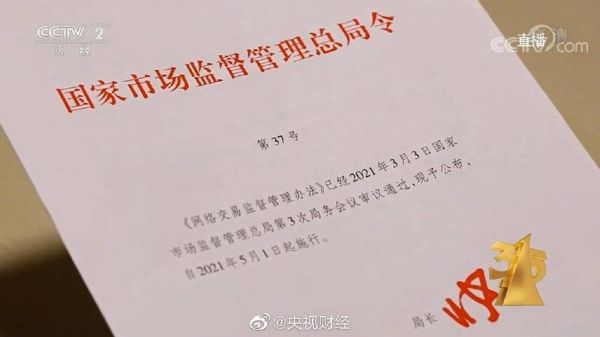 @央视新闻【国家市场监管总局制定出台网络交易监督管理办法】3月15日,由国家市场监督管理总局制定出台的《网络交易监督管理办法》在中央广播电视总台第31届“3·15”晚会现场正式发布。