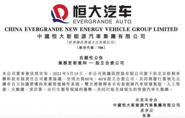 @TechWeb【恒大汽车与腾讯设立合资公司,共同开发车载智能操作系统】3月15日消息,恒大汽车今日在港交所发布公告称,公司与腾讯控股旗下北京梧桐车联科技有限责任公司签署协议,分别出资60%、40%设立合资公司,共同开发行业领先且拥有自主知识产权的车载智能操作系统。根据公告,双方将发挥各自在新能源汽车研发製造、人工智能、大数据、云计算、出行生态等领域的优势,共同打造全球领先的智能汽车生态圈。