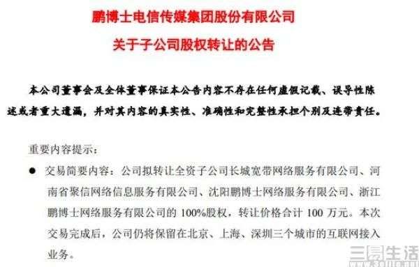 而另一方面,如今长城宽带到底有没有足够的人员来维护现有宽带网络,以及有没有足够的钱退给消费者,可能都已经成为了一个谜团。早在2019年10月,长城宽带宣布调整经营范围,尽管这一行为当时被其母公司鹏博士澄清是为了合规化,将继续为用户提供互联网接入服务。但仅仅在一年之后的2020年9月7日,鹏博士方面就发布公告,宣布将旗下的长城宽带网络服务有限公司等四家公司的100%股权,全部转让给中安实业投资有限公司,转让价格合计100万元,自己则仅保留了北京、上海、深圳三个城市的互联网接入业务。