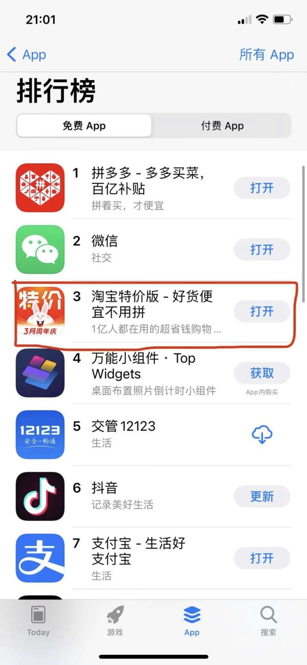 亿邦动力了解到,在APP STORE中,淘宝特价版已经位居免费排行榜的第三位,仅次于拼多多和微信。而根据公开数据,淘宝特价版在去年11月,年度活跃买家用户数已经突破1亿,而当时距离淘宝特价版上线仅有7个月的时间。