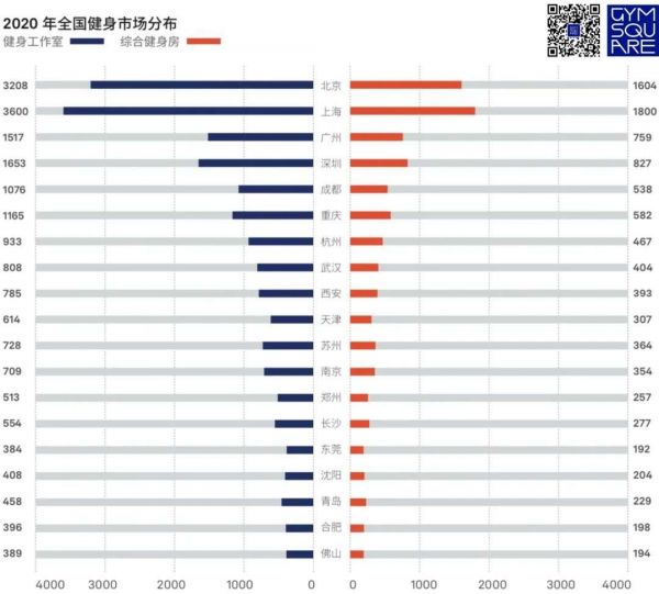 更成熟的健身市场,健身工作室的规模越大,竞争格局也在不断扩大。从精练GYMSQUARE发布的《2020中国健身行业报告》来看,北京健身工作室为3208家,综合健身房和工作室数量大致的占比为3:7;上海工作室数量为3600家,综合健身房和健身工作室的大致占比,也为3:7。