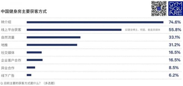 相应的,中国健身房经营者在获客方式上,正呈现出多样化的状态。根据报告的调研问卷统计,目前转介绍依然是中国健身房获客的主要方式,占到74.6%。