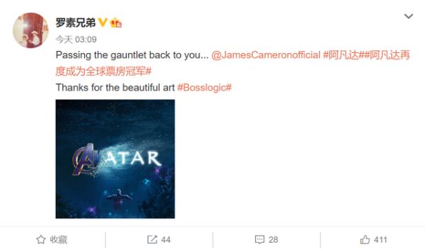 因为这一轮重映,《阿凡达》目前以28.1亿美元的票房打败了《复联4》27.90亿美元的票房成绩,重新夺回了全球影史票房第一,就连《复联4》导演罗素兄弟也发文表示庆祝。