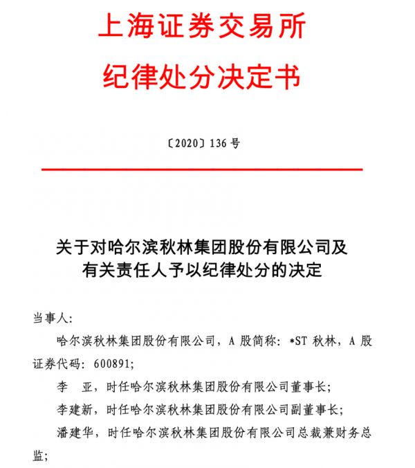 2020年3月,上交所对秋林集团时任董事长李亚、时任副董事长李建新予以公开谴责,并公开认定李亚、李建新10年内不适合担任上市公司董事、监事和高级管理人员等。