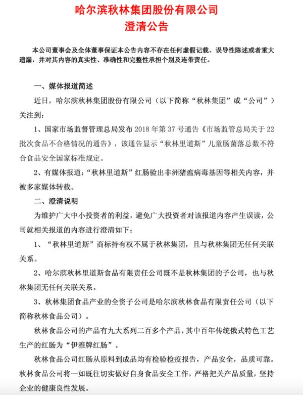 哈尔滨秋林食品厂则更名为哈尔滨秋林食品有限责任公司(下称“秋林食品公司”)。2012年,秋林食品公司回归至秋林集团旗下,成为其全资子公司。