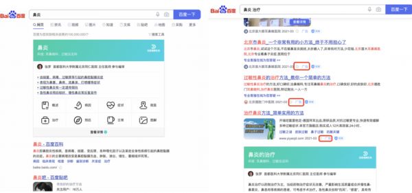 此外,在搜索中加入治疗、医疗,出现的结果也是不一样的——正常搜索看起来推荐的都是专业性内容,但是只要对关键词稍加变化,中间加空格或者输入治疗、医院相关的搜索词,结果就会大不一样。比如在百度搜索鼻炎,呈现结果是专业知识介绍,而搜索鼻炎治疗,前四个搜索结果均是广告。