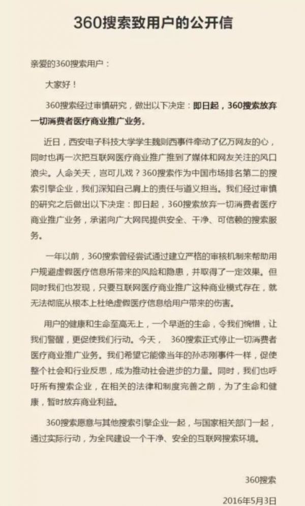 2016年,“魏则西事件”爆发后,百度深陷舆论漩涡、遭国家多部门联合调查、股价大跌。同时,360搜索发表用户公开信,宣布放弃一切消费者医疗商业推广业务。