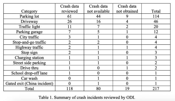 从NHTSA最终公布的评估概要中,可以发现,在纳入到调查范围的217起事故中,绝大多数是车辆在非交通道路上的低速甚至接近停止状态的情况下发生,如停车场(114起)、家庭车库前车道(46起)、交通灯处(20起)、大型停车库(12起),占到全部事故的88%,在城市交通道路和高速上发生的事故各为4起。