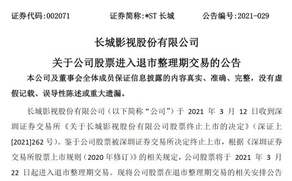 近日,长城影视发布公告,宣布收到深圳证券交易所《关于长城影视股份有限公司股票终止上市的决定》,公司股票将于3月22日起进入退市整理期交易。在这之前,长城影视股票已经连续二十个交易日的每日收盘价均低于1元,触发1元面值退市的股权交易规则,被深交所决定终止上市。1月28日,长城影视股价最终定格在0.46元,公司进入退市整理期,退市已成定局。