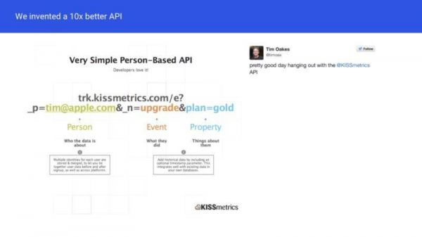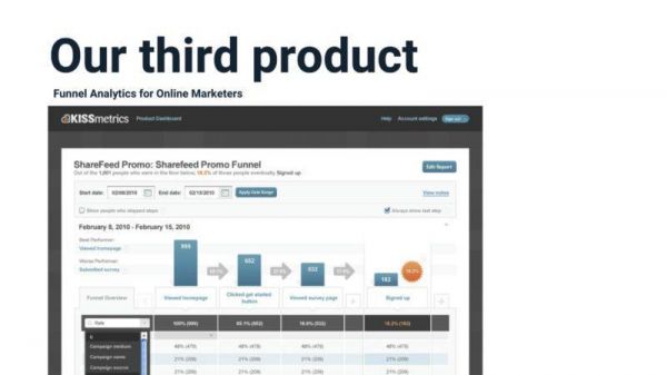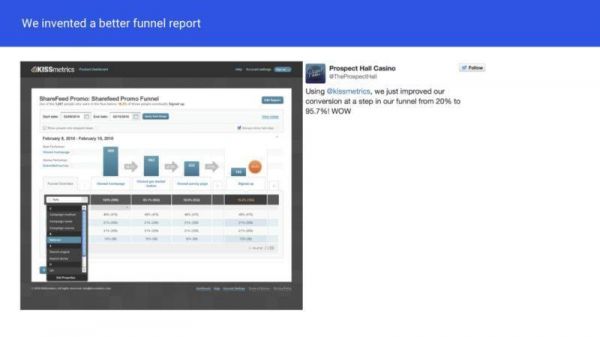 以漏斗报告为例,在 KISSmetrics 之前,人们花太多时间来创建和理解漏斗报告。我们的漏斗报告最后成为许多分析工具复制的行业标准。
