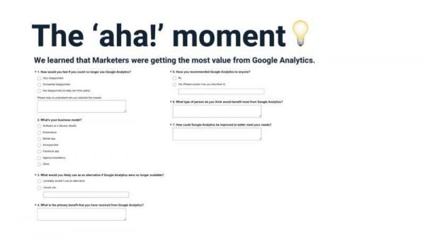 我们不得不向后退一步,立即停止开发我们“以为”市场想要的东西,回到最基本的问题上来。我们停下敲代码的手,走出去和客户交谈。我们采访了使用 Google Analytics 的人,这款产品是我们最大的竞争对手。我们向他们提出问题,以便更好地了解他们的需求以及使用分析软件时遇到的问题。他们有很多话要说,于是我们就耐心地聆听着。