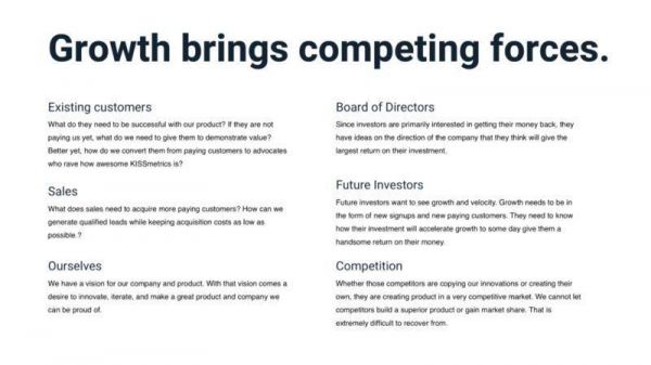 最坏的情况是,你会阻碍产品的发展势头,让竞争对手迅速成长超过你。相信我,这会发生的。尽管我们比竞争对手在整个项目上领先 3 年,但对于 KISSmetrics 而言,竞争对手仍然缩小了与我们之间的差距。