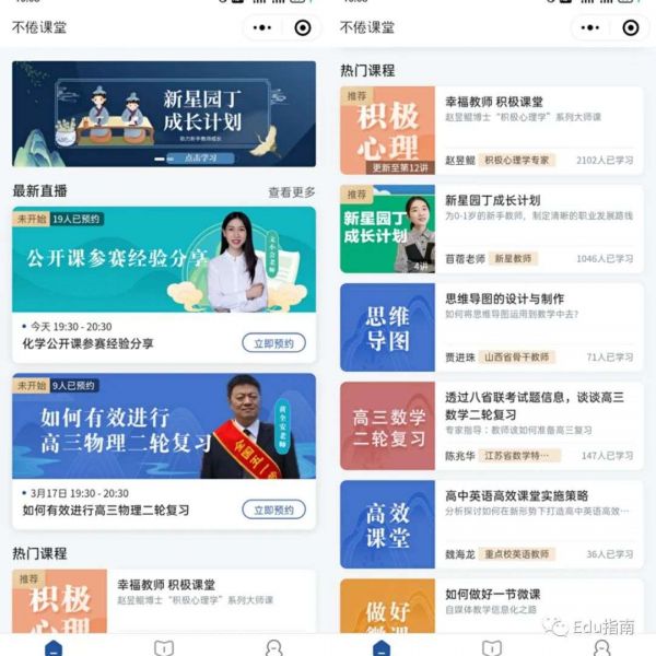 打开不倦课堂,可以看到小程序主页,是不倦课堂近期活动的教师培训计划,经验分享线上直播。以及相对热门的课程系列:比如积极心理学、教师园丁成长计划、思维导图、数学、英语等学科备课攻略等等。