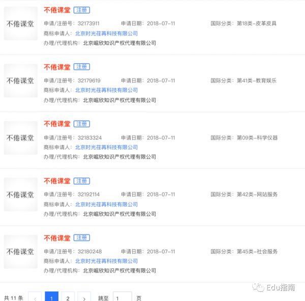 不倦课堂小程序的上线时间是2021年的1月。不过从工商信息来看,“不倦课堂”的商标在更早之前的2018年就进入了申请流程,图中商标申请人“北京时光荏苒科技有限公司”法人是字节高管韦雄瀚。