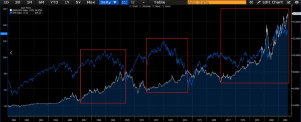 当然,有人会说Regime Change,美国10年期国债收益率上涨周期的背景肯定和下跌周期不一样。那么分开来看,下图是1962年到1981年美国10年期国债收益率上涨的19年,三个红框为国债收益率持续大幅上涨的阶段,对应标普500指数,前两个红色框都是先涨后跌,第三个红框是先跌后涨。