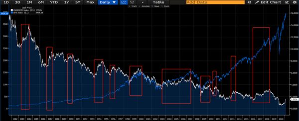 下图是1981年至今美国10年期国债收益率下跌的40年,红框同样标注了国债收益率上涨时标普500的表现。从这些红框中可以看到,在10年期国债收益率上涨的时候,标普500有时候下跌,有时候震荡,还有不少时候在上涨。
