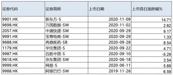 下表10家公司中,9家上涨,仅百胜中国下跌5.29%,而百胜中国下跌也主要是受到美股连续下跌的影响,导致其美股股价低于港股发行价,引起资金出逃。整体来看,10家公司首日涨跌幅平均数为5.16%,中位数为5.20%,具有不错的涨幅。