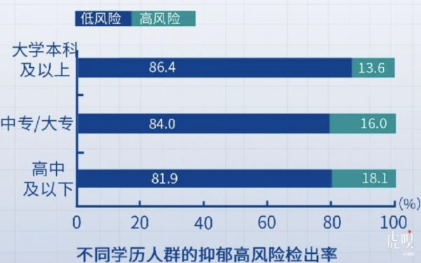 另外,学历越高,心理健康水平越高,特别是大学本科及以上学历人群的心理健康水平高于更低学历人群,其中高中及以下学历人群抑郁高风险的检出率为18.1%,比大学本科及以上人群高出近5个百分点。