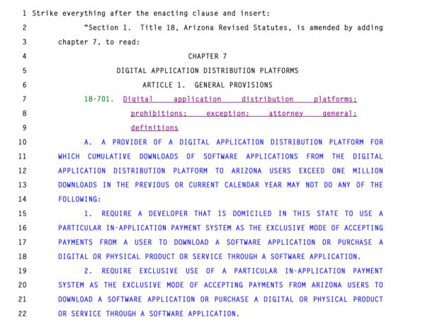 在这几年间,越来越多的人把目光放在了苹果、谷歌与反垄断议题上。今年3月,美国亚利桑那州众议院以31票对29票的结果通过了一项新法案,这一法案是亚利桑那州原有H.B. 2005法案的一项修正案,其主要内容是:在上一年及本年度内,假如数字应用分发平台向亚利桑那州用户提供的应用软件累计下载量超过100万次,则平台的供应商不能要求在亚利桑那州注册的软件开发商使用平台规定的唯一付款系统,也不能要求用户使用平台规定的付款系统作为购买软件或服务的唯一付款方式。与此同时,平台供应商也不能针对第三方支付平台反诉开发商和用户。