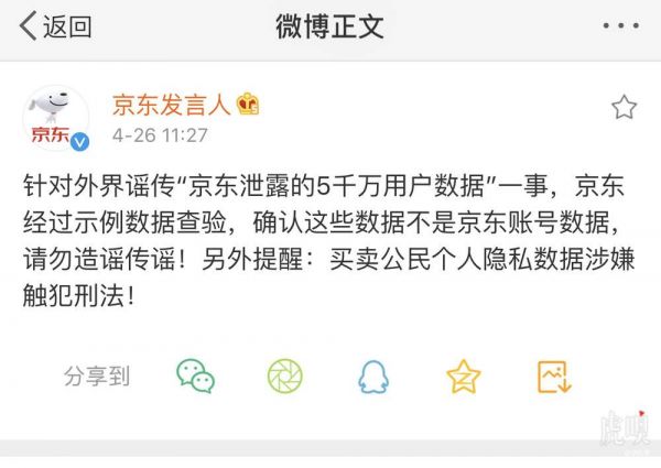 京东发言人:针对外界谣传“京东泄露的5千万用户数据”一事,京东经过示例数据查验,确认这些数据不是京东账号数据,请勿造谣传谣!4月25日有网图流传,在一些黑客群号称有5000万+的京东数据可售卖,具体信息包含手机、邮箱、用户名和交易密码等关键数据。