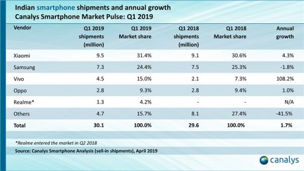 智能手机数据研究公司canalys发布了2019年Q1印度市场的智能手机份额,小米、三星、vivo、OPPO 分列前四。其中小米出货量为950万台,同比增长4.3%;三星出货量为730万台,同比下滑1.8%;vivo出货量为450万台,同比增长108.2%;OPPO出货量为280万台,同比增长1%。