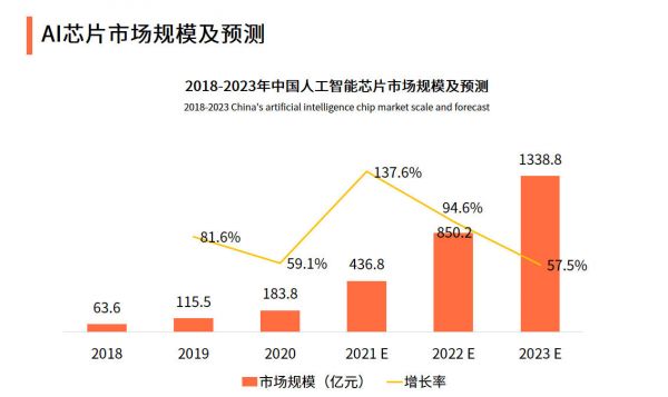 来自iiMedia Research(艾媒咨询)的数据显示,2018年时,我国的AI芯片市场规模仅为63.6亿元,随后开始大规模增长,2020年市场规模已经达到了183.8亿元,预计今年的增长率将达到137.6%,市场规模来到436.8亿元。根据预测,我国的人工智能芯片市场规模将在2023年达到1338.8亿元。
