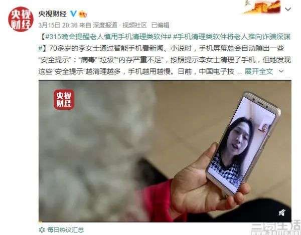 在昨晚刚刚举行的央视3·15晚会上,除了关注“瘦肉精”、翻新钢筋、汽车变数箱生锈等与消费者衣食住行息息相关的问题之外,同样也聚焦了数字时代的一些新问题。其中就曝光了手机清理APP的骗局,指出一批手机清理类软件名义上是清理手机垃圾文件,实则化身窃取用户手机中敏感信息的黑手。并且很快与这一报道相关的#315晚会提醒老人慎用手机清理类软件#话题,就登上微博热搜榜。