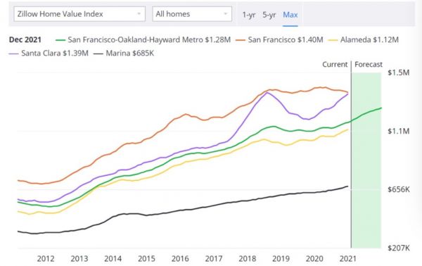 硅谷各主要地区的房价走势,图片来自于Zillow