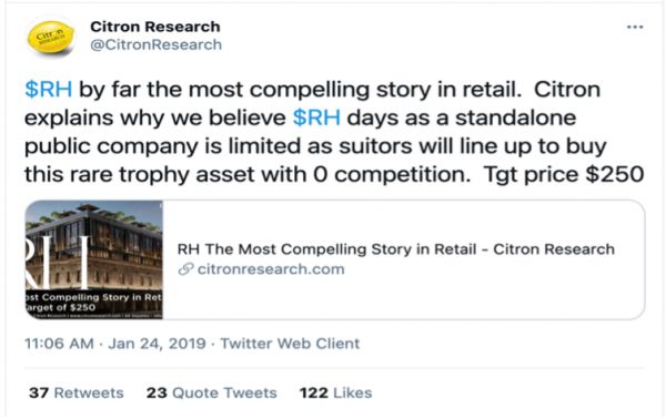 香橼研究在2019年1月24日发布推文,公开力挺RH,称其为“零售业最吸引人的故事”,并给出250美元的目标股价。