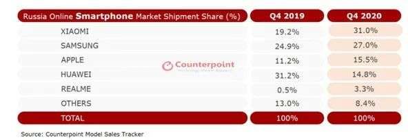 根据Counterpoint Research发布最新的研究报告显示,在2020年Q4,小米手机占据俄罗斯手机市场第一名,获得了31%的市场份额;三星第二,获得了27%的市场份额;苹果以15.5%的市场份额位列第三。
