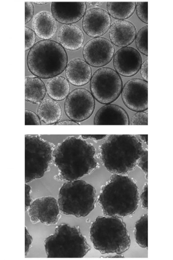相比现代人的大脑类器官(上图),携带古人类变异基因的大脑类器官(下图)更小,且肌理粗糙。来源:C. A. Trujillo et al./Science